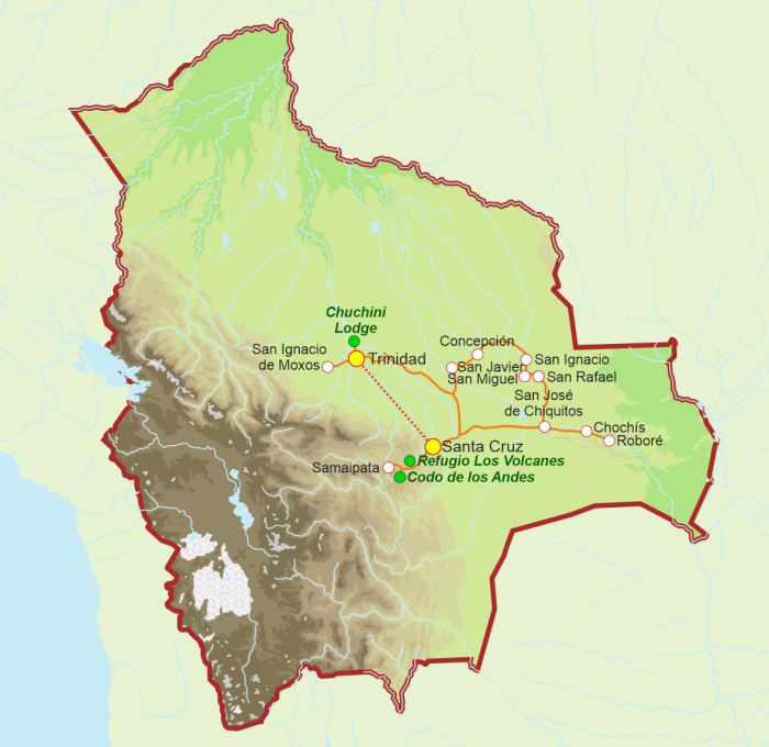 Bolívia természetföldrajzilag két nagy és több kisebb egységre osztható. Az ország nyugati 1/3-át az Andok hegyláncai és az Altiplano uralja, a keleti 2/3-ot pedig Amazónia és a Gran Chaco, valamint az azt összekötő Chiquitania. A túra alatt Amazóniát és Chiquitaniát járod be, de pár napra a Keleti-Andok alsóbb régióiba is teszel egy kitérőt.
