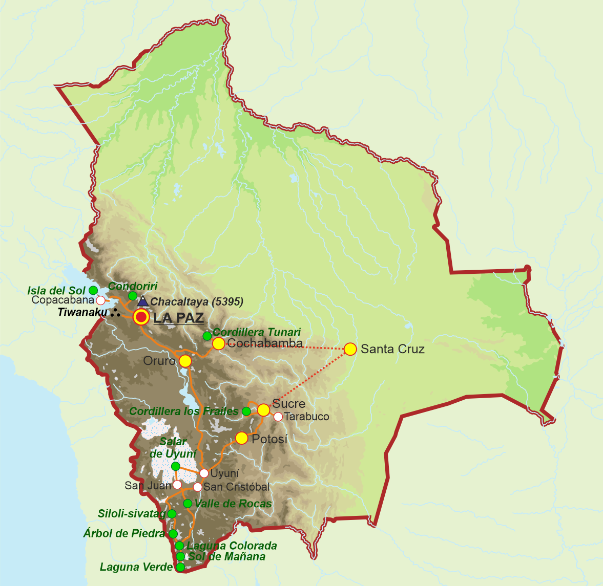 Bolívia természetföldrajzilag két nagy és több kis egységre osztható. Az ország nyugati 1/3-át az Andok hegyláncai és az Altiplano uralja, a keleti 2/3-ot pedig Amazónia és a Gran Chaco. A túra alatt az ország andoki területeit és Santa Cruz térségét járod majd be.